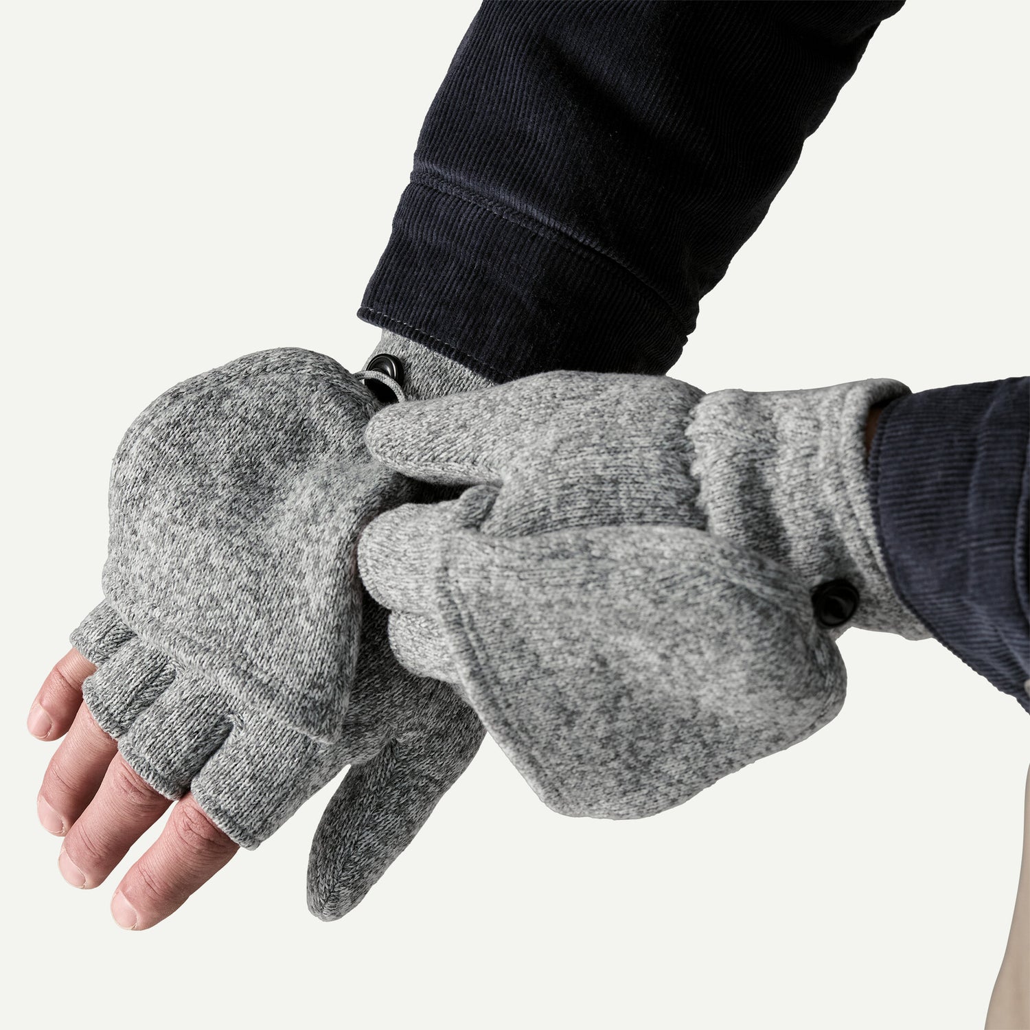 温かいミトンとしても、指先を使えるフィンガーレス・グローブとしても活躍する多機能タイプ。リサイクル・ポリエステル100%のセーターニット・フリース素材を使用し、軽量で柔らかく快適。ミトン部分は折り返してボタンで固定でき、着脱しやすいループ付き。伸縮性のあるカフスが冷気の侵入を防ぎ、アウトドアでも日常でも使いやすい一品です。