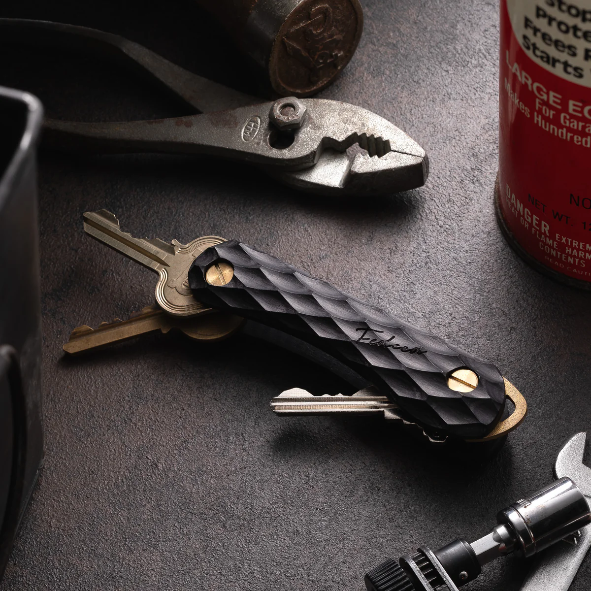 FEDECA キーオーガナイザーは、ナイフづくりで培った技術を活かし、鍵を美しくまとめるために生まれた一本。木のぬくもりと真鍮パーツの質感が手に馴染み、使うほどに味わいが深まります。鍵はネジで簡単に着脱でき、最大5枚まで収納可能。日常に温かみを添える機能美が魅力のキーオーガナイザーです。☆