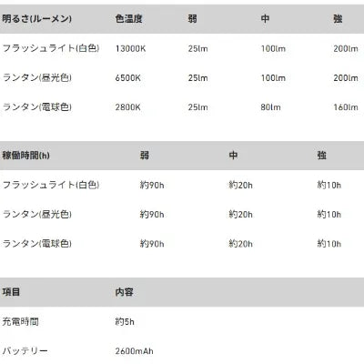 ランタン・フラッシュライトともに、**「弱 → 中 → 強」**の3段階に調光可能。起動時のまぶしさを軽減し、より快適に使える仕様に。