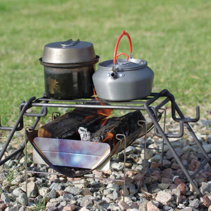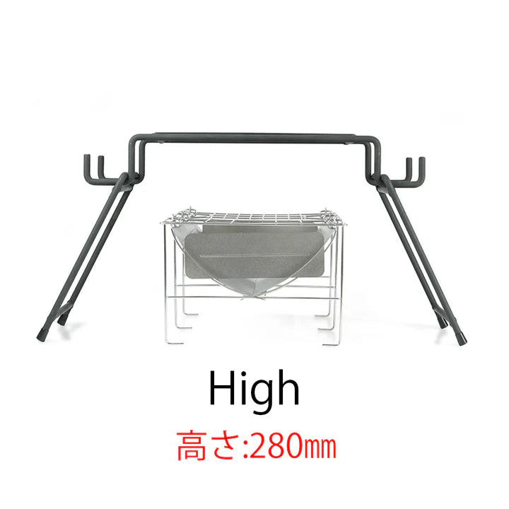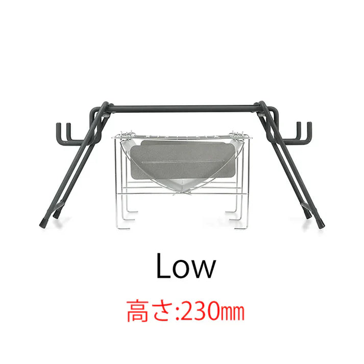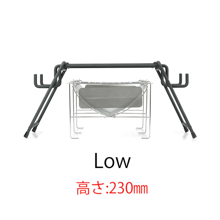 ウッドストーブや小型の焚き火台にジャストサイズ。脚をセットする位置を変えるだけでお使いの焚火台に合った高さに変えられます。また、収納時の高さは7cmになります。