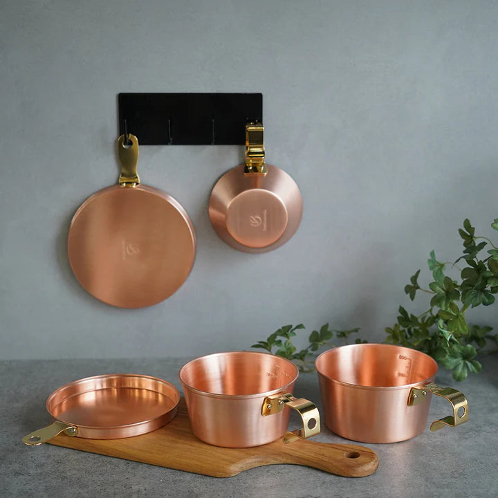 直火OKで火の通りにムラが出ず、食材に均等に熱が行き届くので美味しい料理に仕上がります。錆びにくく、使い込む程に銅ならではの深みのある飴色への変化もお楽しみいただけます。真鍮製ハンドルとの組み合わせでクラシックな雰囲気ですので日常使いにもおすすめ。