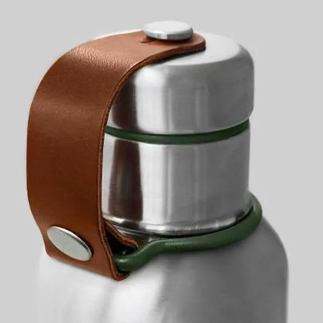 ヴィーガンレザーのベルトが蓋と繋がっているので、蓋を落とす心配もありません。