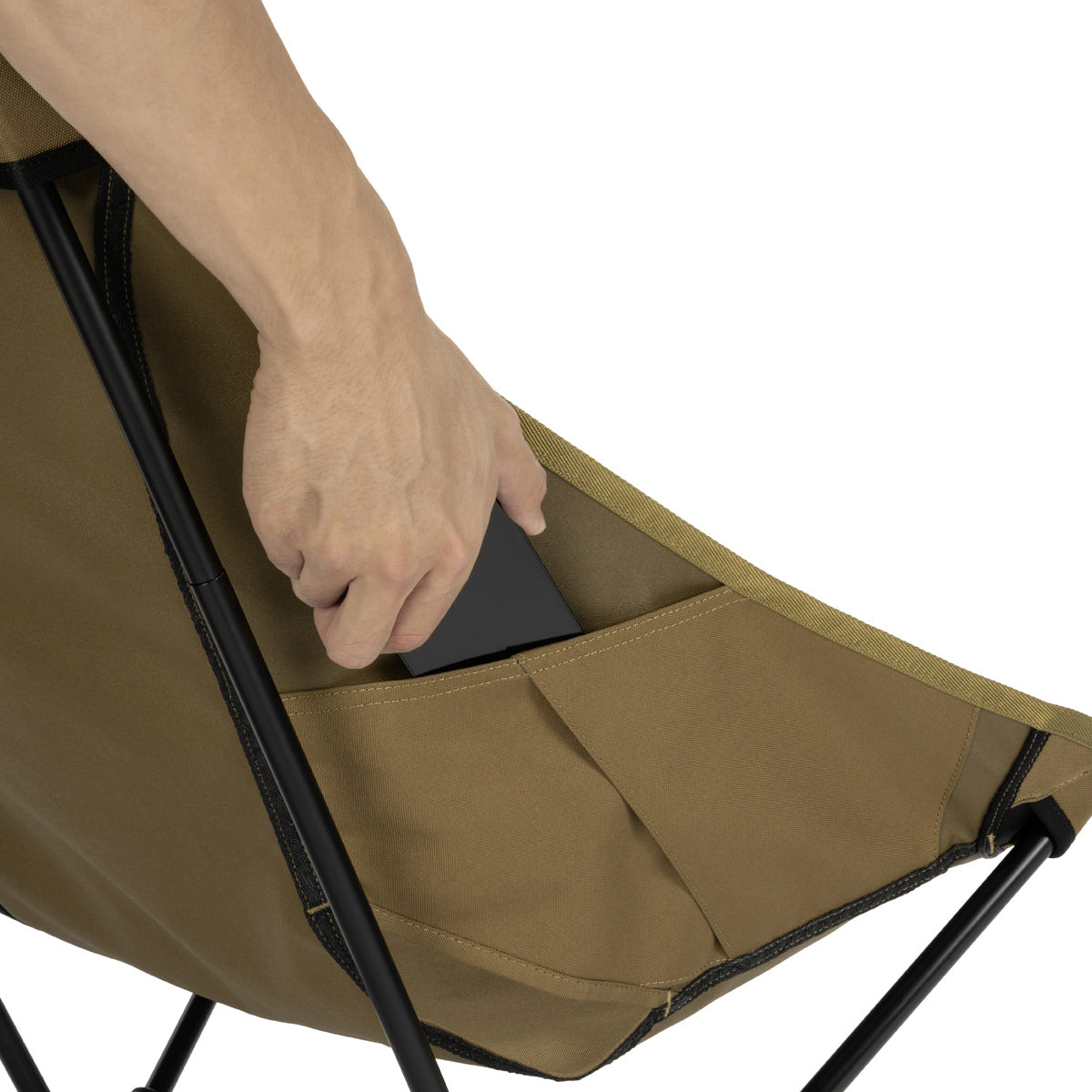 タクティカルチェアをベースに背もたれを長くし、よりリラックスできるようにデザインされたハイバックチェアです。座面の高さもロースタイルに丁度良い設定となっています。スタッフバッグ(収納袋)を足下のフレームに取り付けると、小物入れとしても利用できます。