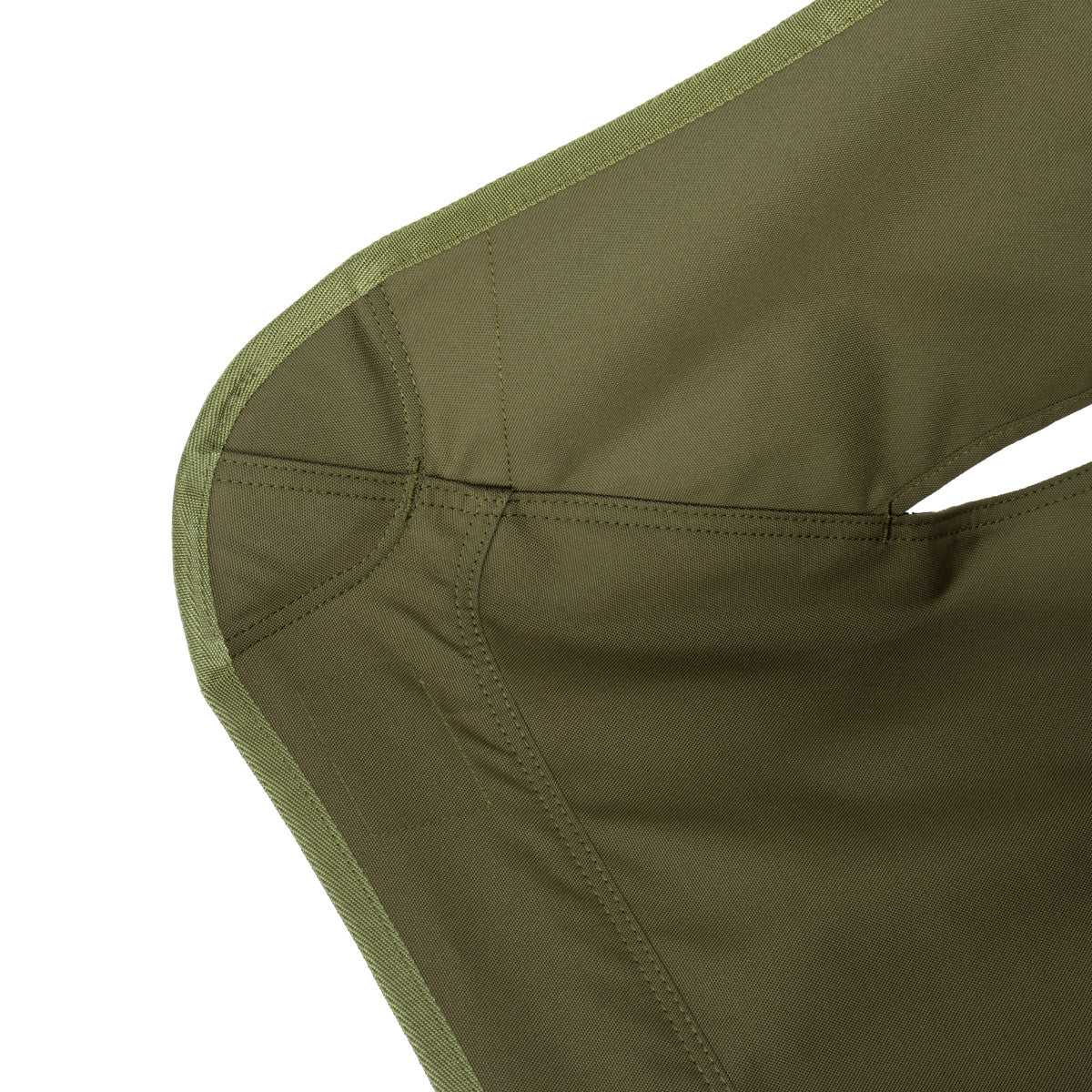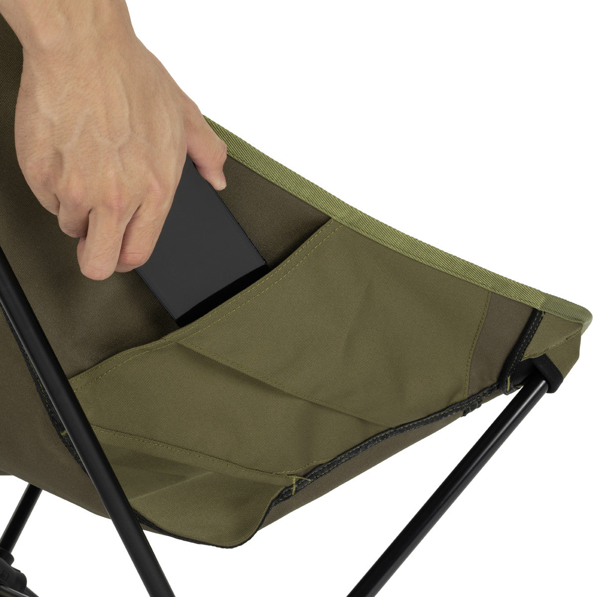 タクティカルチェアをベースに背もたれを長くし、よりリラックスできるようにデザインされたハイバックチェアです。座面の高さもロースタイルに丁度良い設定となっています。スタッフバッグ(収納袋)を足下のフレームに取り付けると、小物入れとしても利用できます。