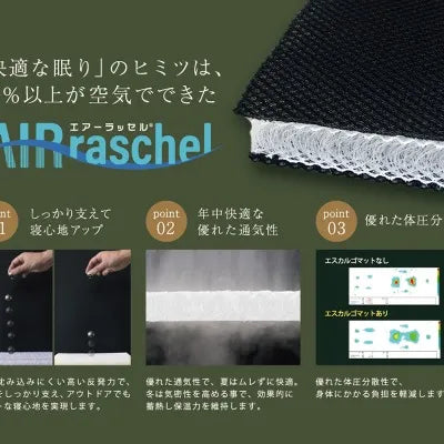 従来モデルは11mm厚のエアーラッセルを2枚重ねていましたが、リニューアルにより22mm厚の一枚構造に変更。これによりクッション性が向上し、自宅のベッドマットに近い快適な寝心地を実現しました。