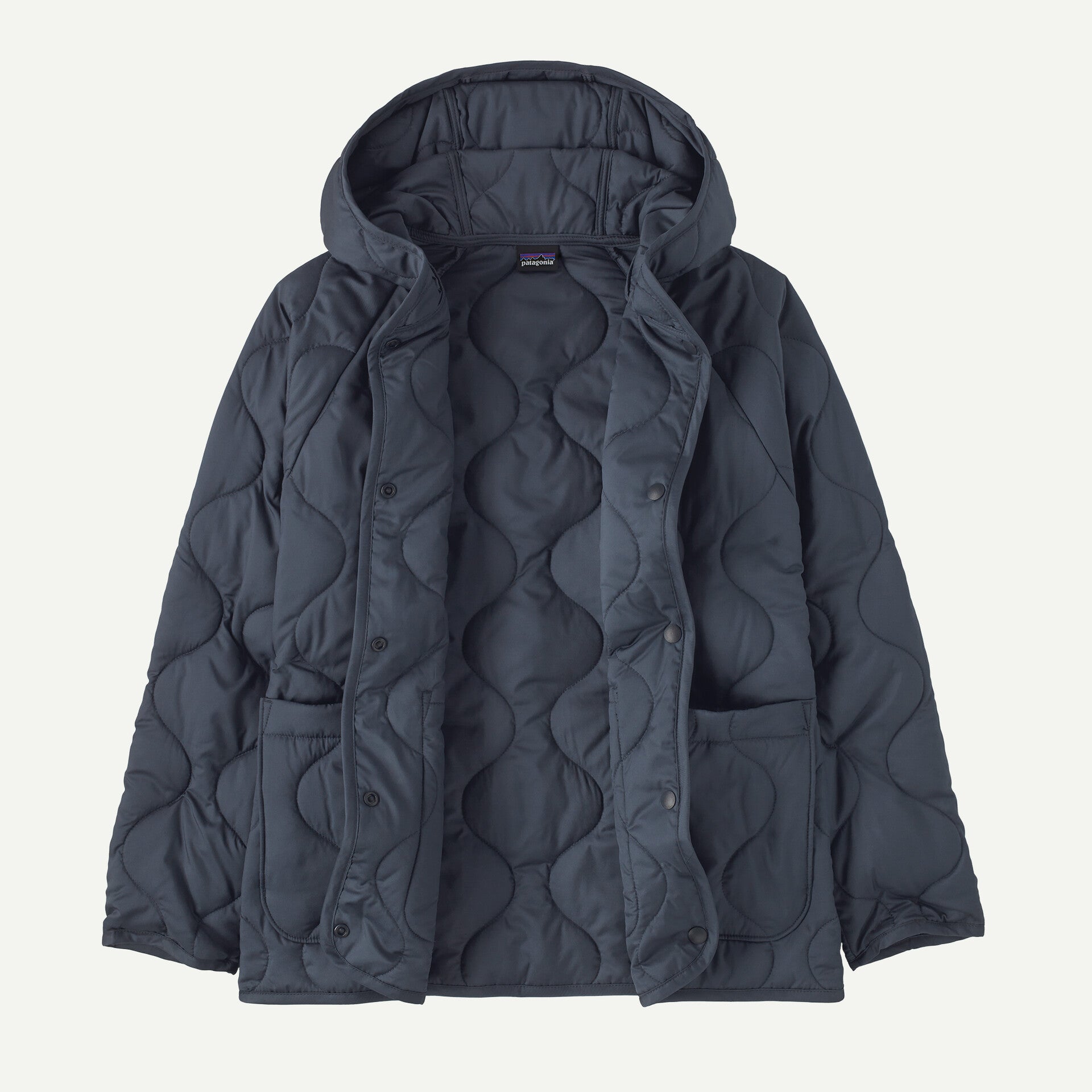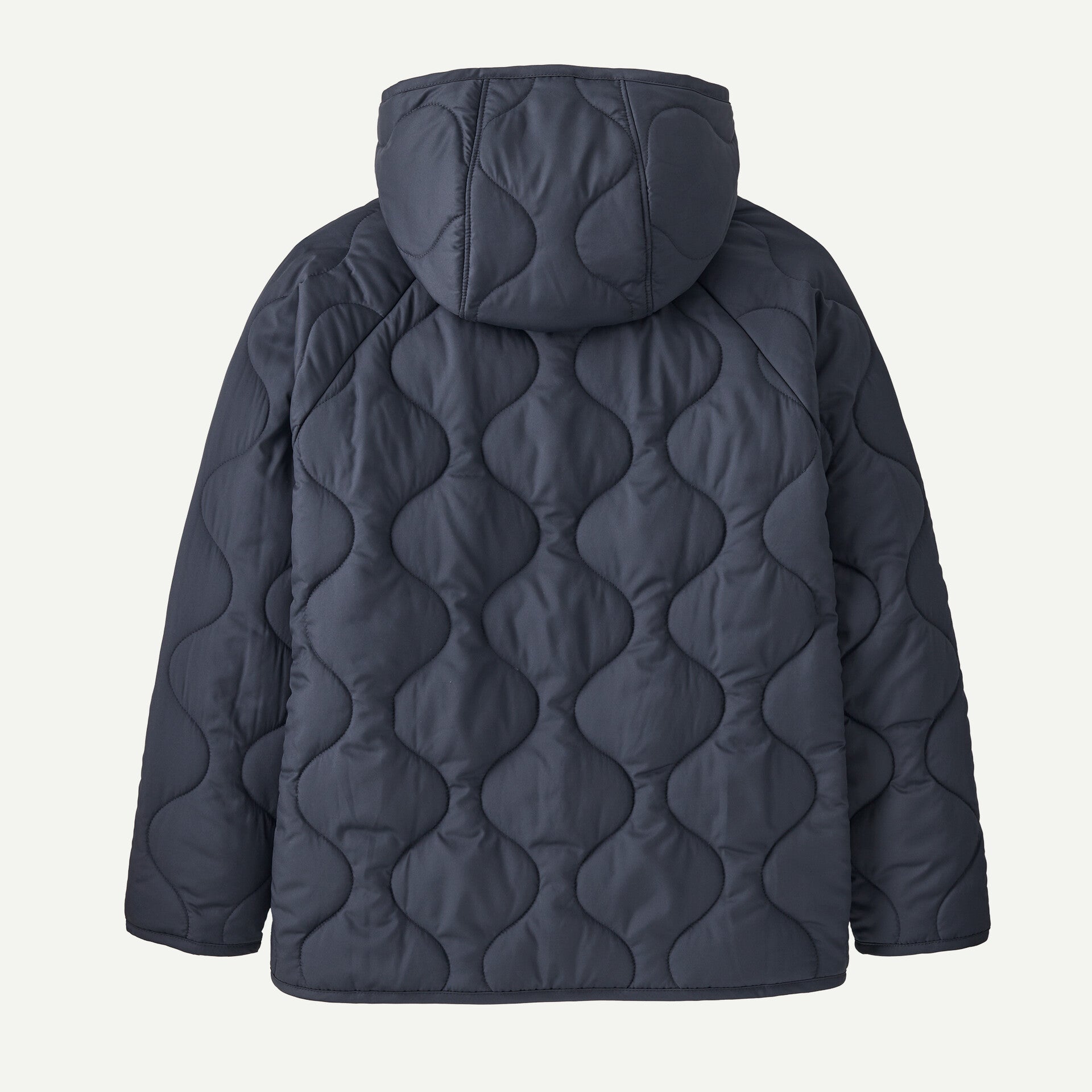 フード、フロント中央、裾、袖口に共布の縁取りを施した、フロントがスナップ留めで着用しやすいフーディ。80グラム・サーモグリーン・リサイクル・ポリエステル100%のインサレーション入り