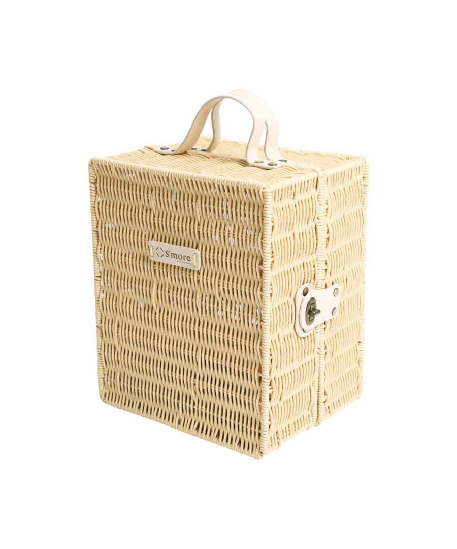 耐久性のある藤草風プラスチック素材を一つずつ手作業で編み込んだ小型の収納ボックスです。
