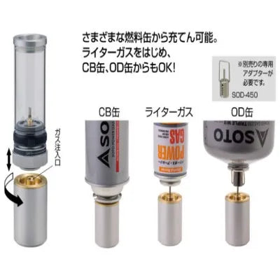 ライターガスをはじめ、 CB缶、OD缶(※)からも充填可能。