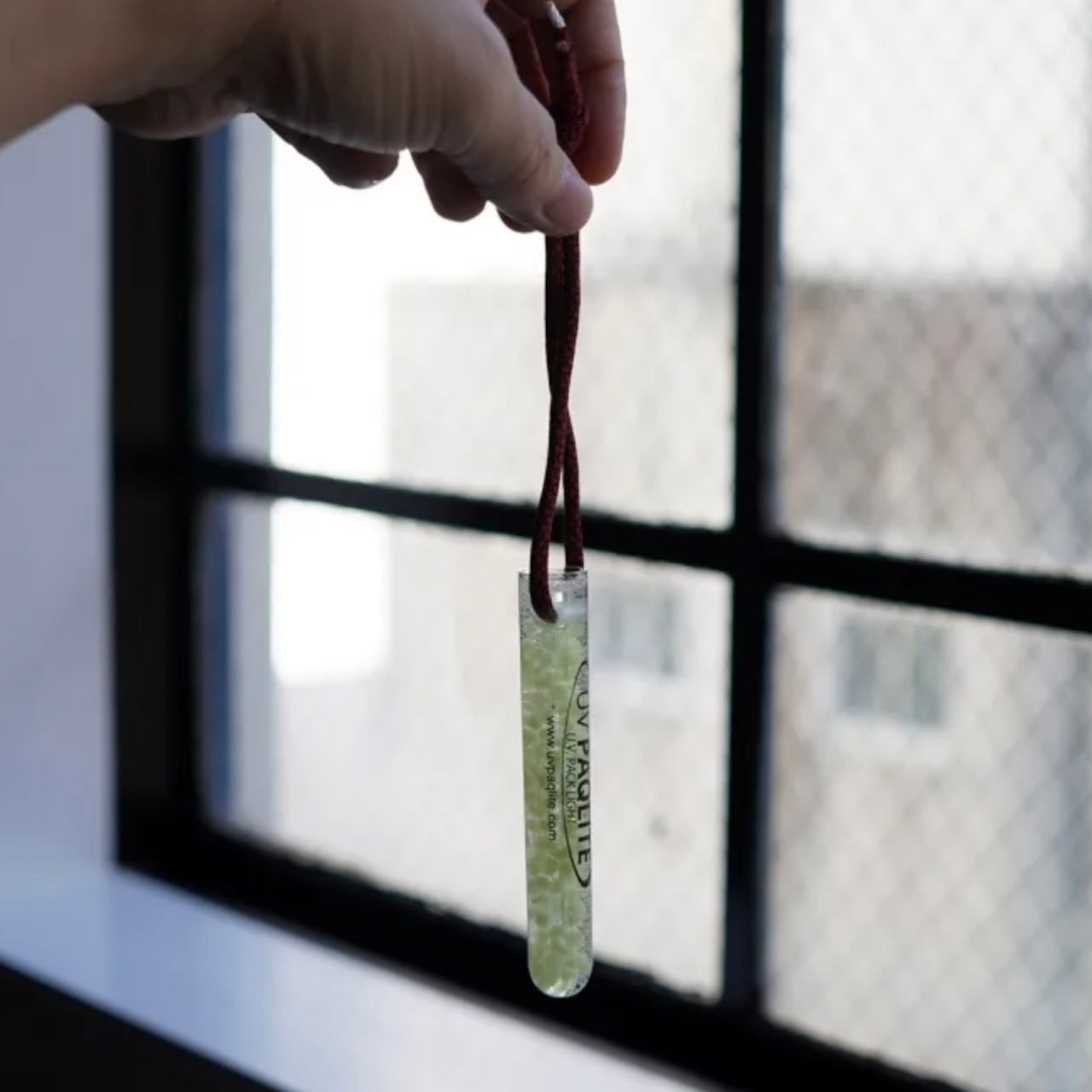 蓄光性粒子を、樹脂(レジン)で固め、プラスチックチューブに閉じ込め、キーホルダーサイズのスティックに。